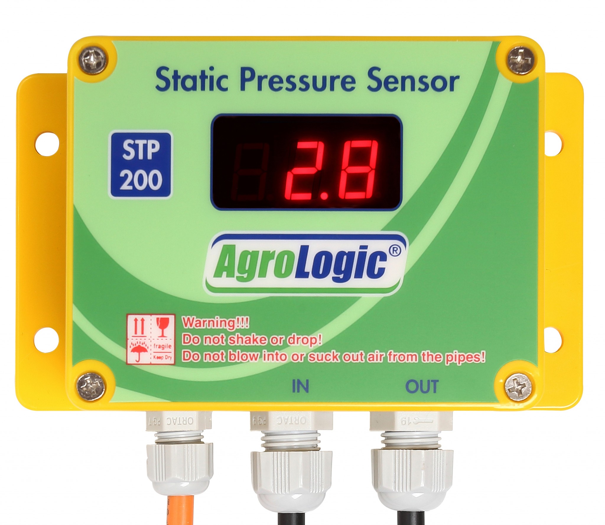 The STP200 is a highly sensitive static pressure sensor that can be connected to AgroLogic’s climate control units. It features a built-in digital display showing the current pressure reading.