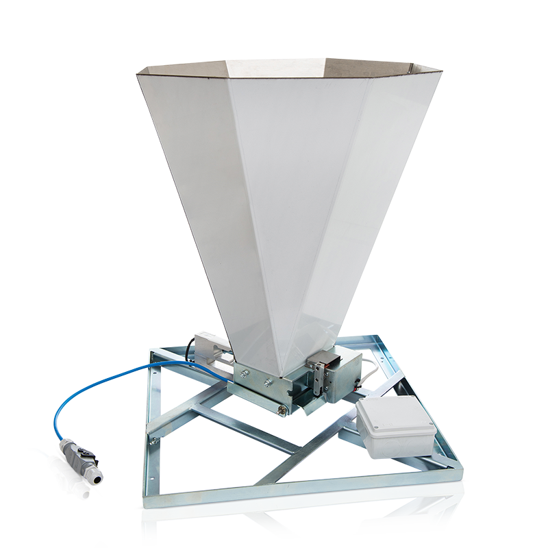 After the feed is weighed, the electronic door at the bottom of the cone opens automatically.